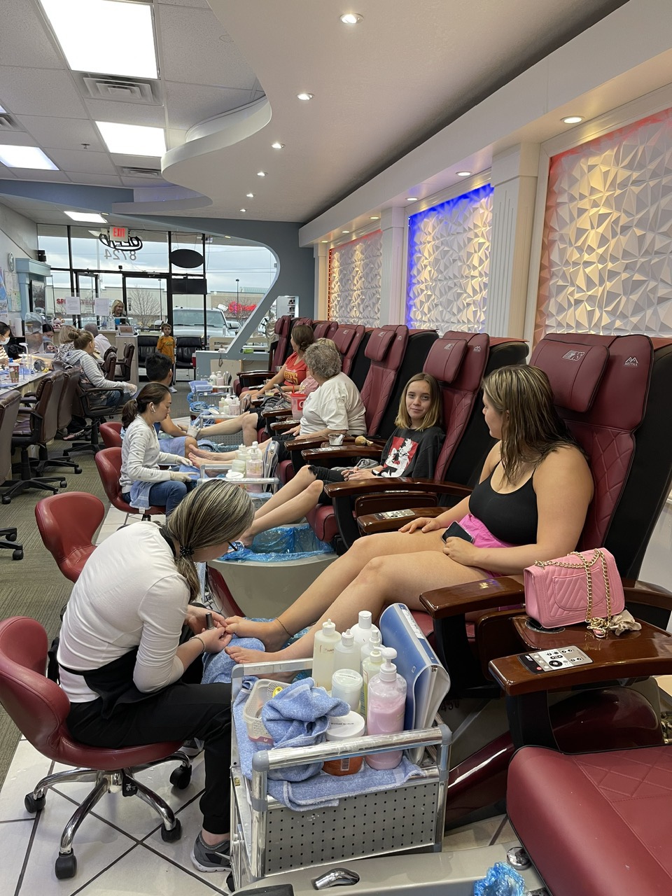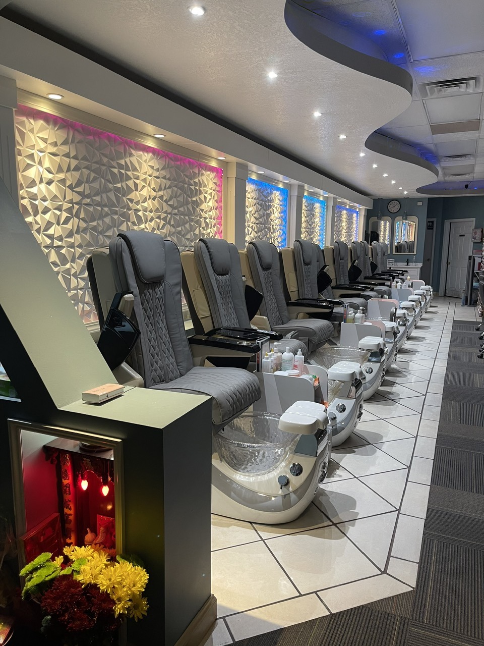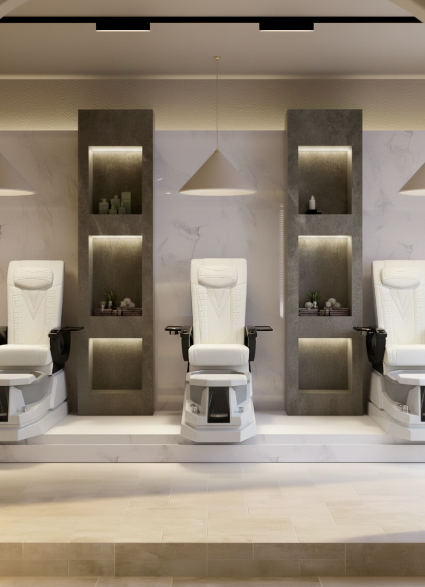 A clean, bright pedicure area equipped with premium spa chairs. Comfort seating, soft-glow LED basins, and curated product displays deliver a professional experience.