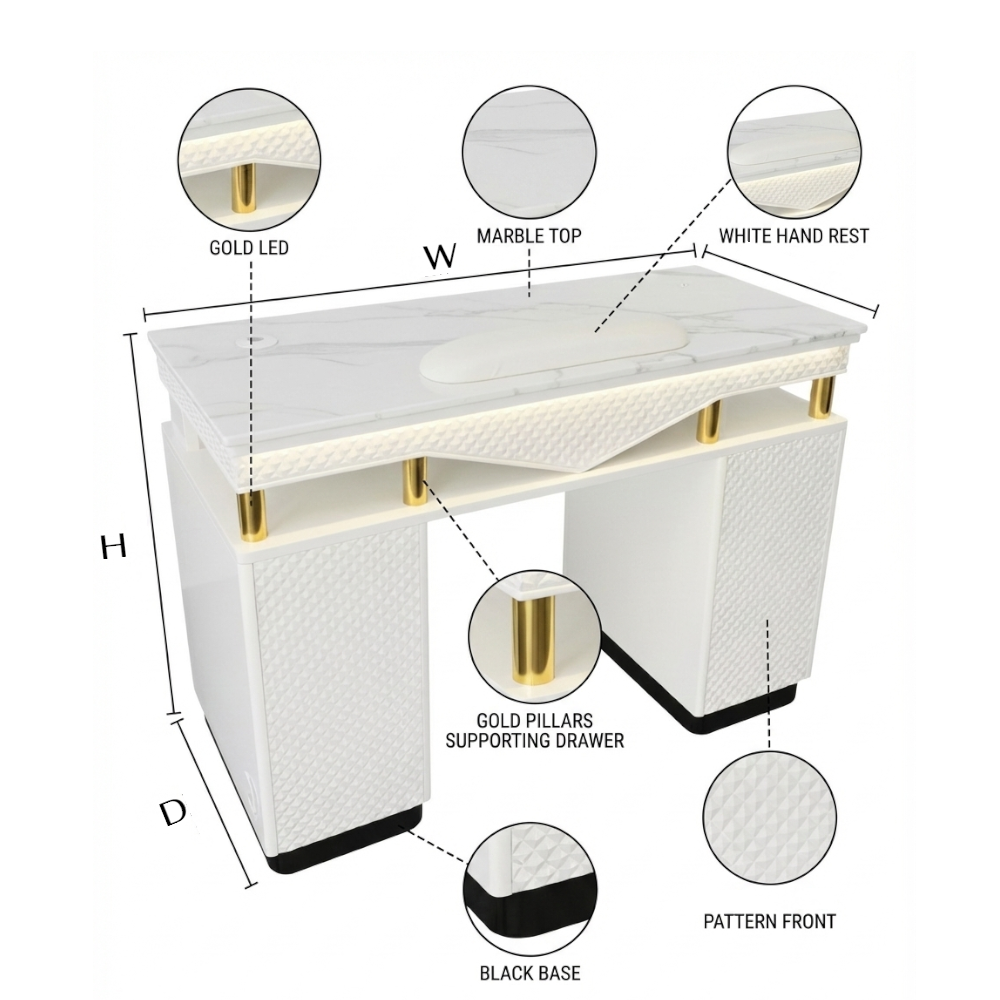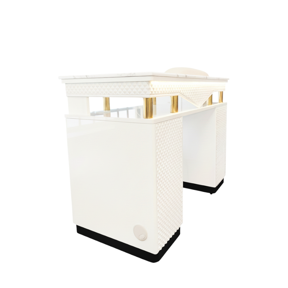 The H White Gold Single Manicure Table is designed for salons that value refinement, balance, and a polished visual identity. Its white-and-gold finish creates a bright, elegant focal point that elevates the manicure area without overwhelming the space. This model fits seamlessly into salons that favor clean layouts, soft luxury tones, and a calm client experience. Beyond aesthetics, the single-seat configuration supports focused, high-quality service. It is ideal for private manicure rooms, boutique salons, or VIP setups where attention to detail matters. The table offers sufficient workspace for daily operations while maintaining an uncluttered, intentional appearance. This version is especially suited for salon owners who see manicure services as part of a premium brand experience. The H White Gold Single helps communicate sophistication, cleanliness, and care—qualities that clients notice immediately and associate with higher service standards.