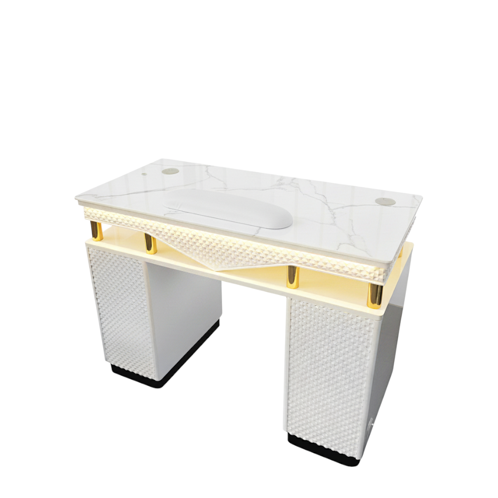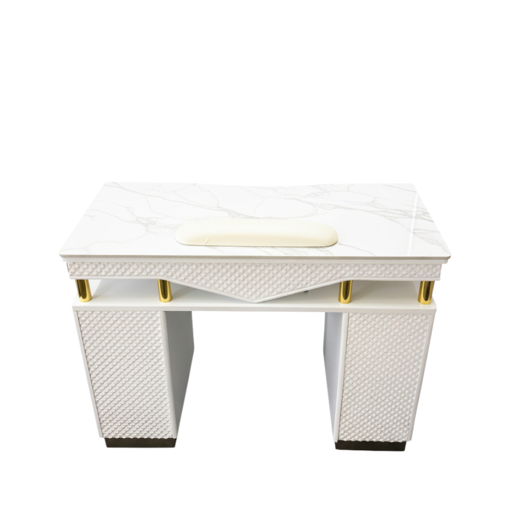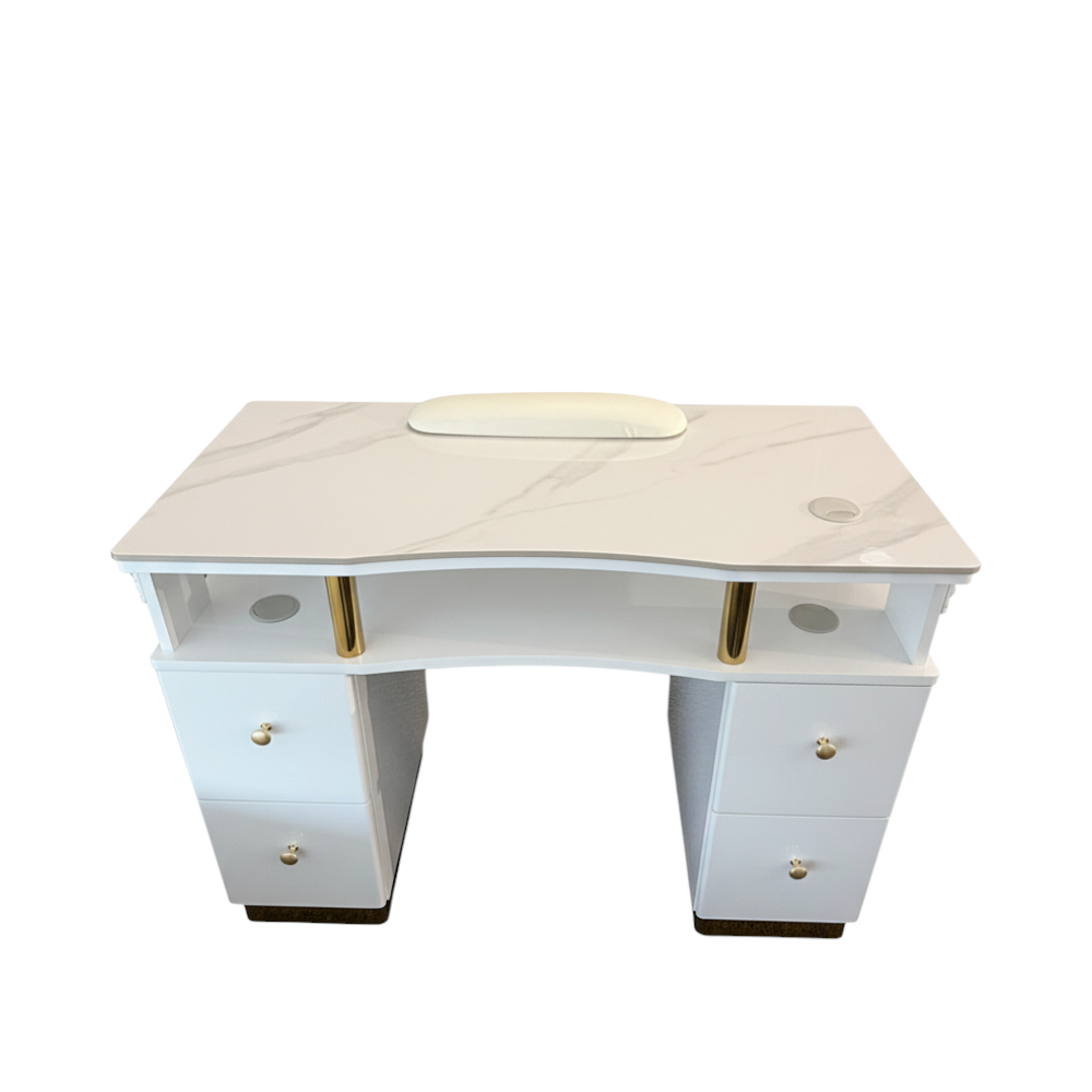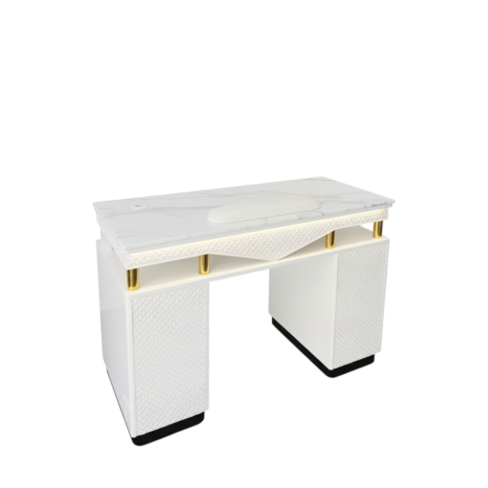A single-seat manicure table combining white surfaces with gold accents for clean elegance.