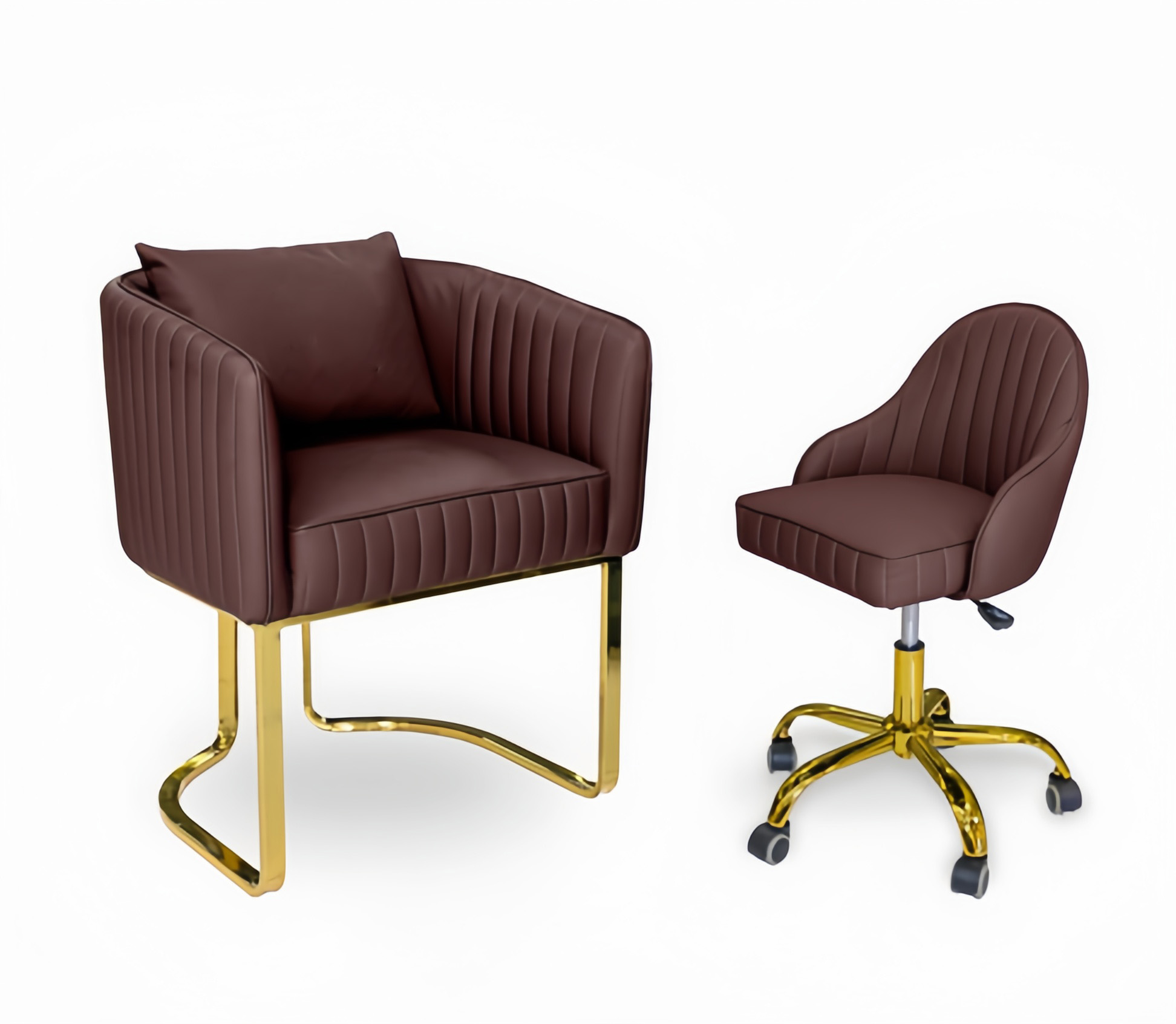 The salon furniture set includes a Customer Chair, a Technician Chair, and a back pillow. Available in Gray, Black, or Khaki with Gold or Chrome legs. Spacious, durable, and acetone-resistant leather combo suitable for various salon setups