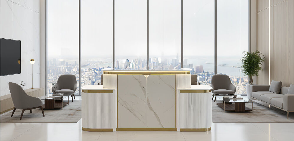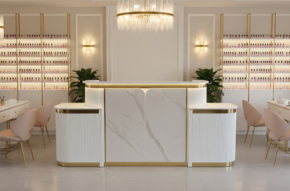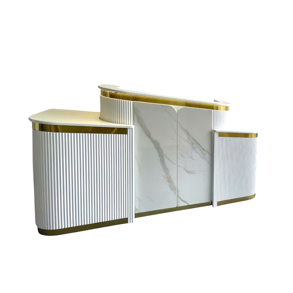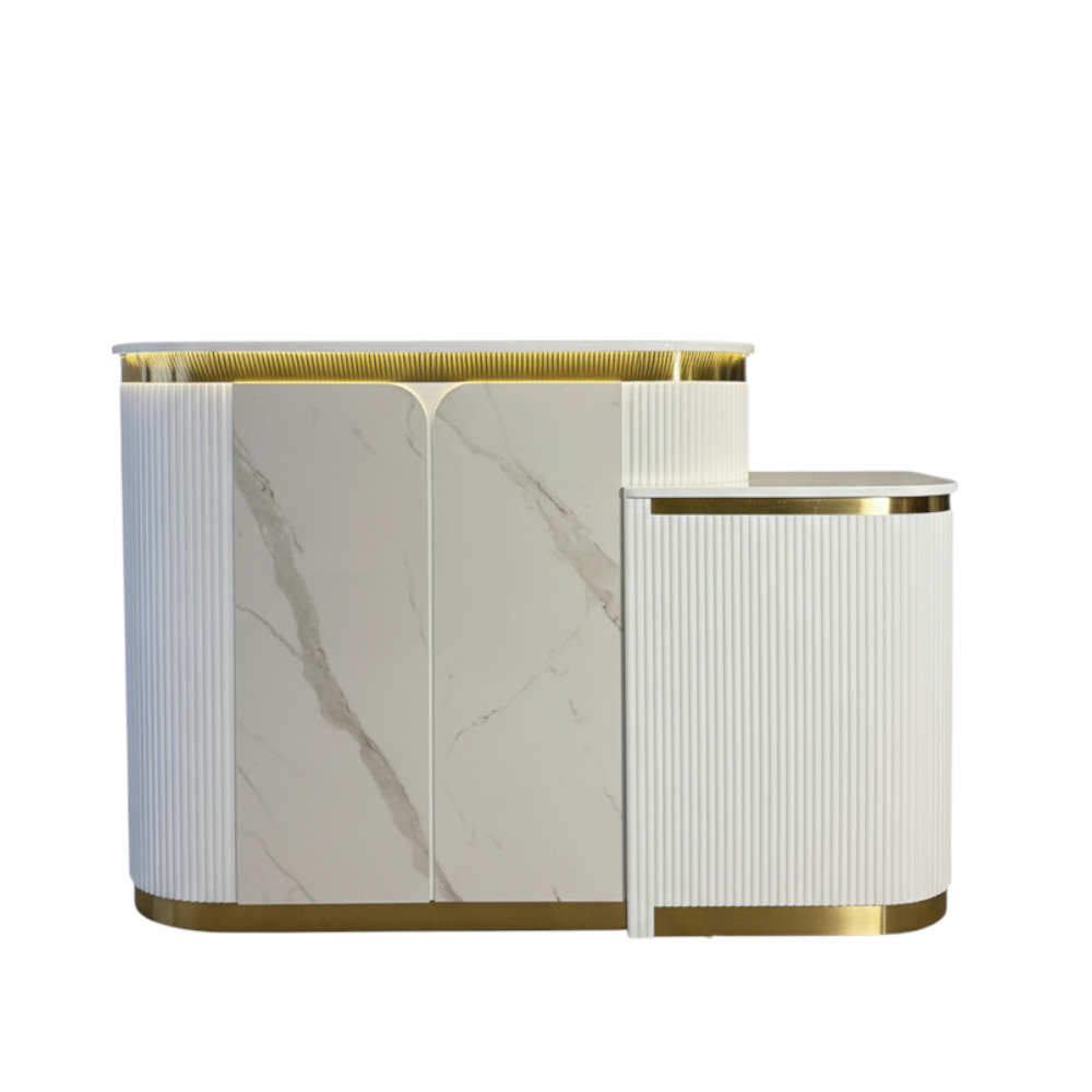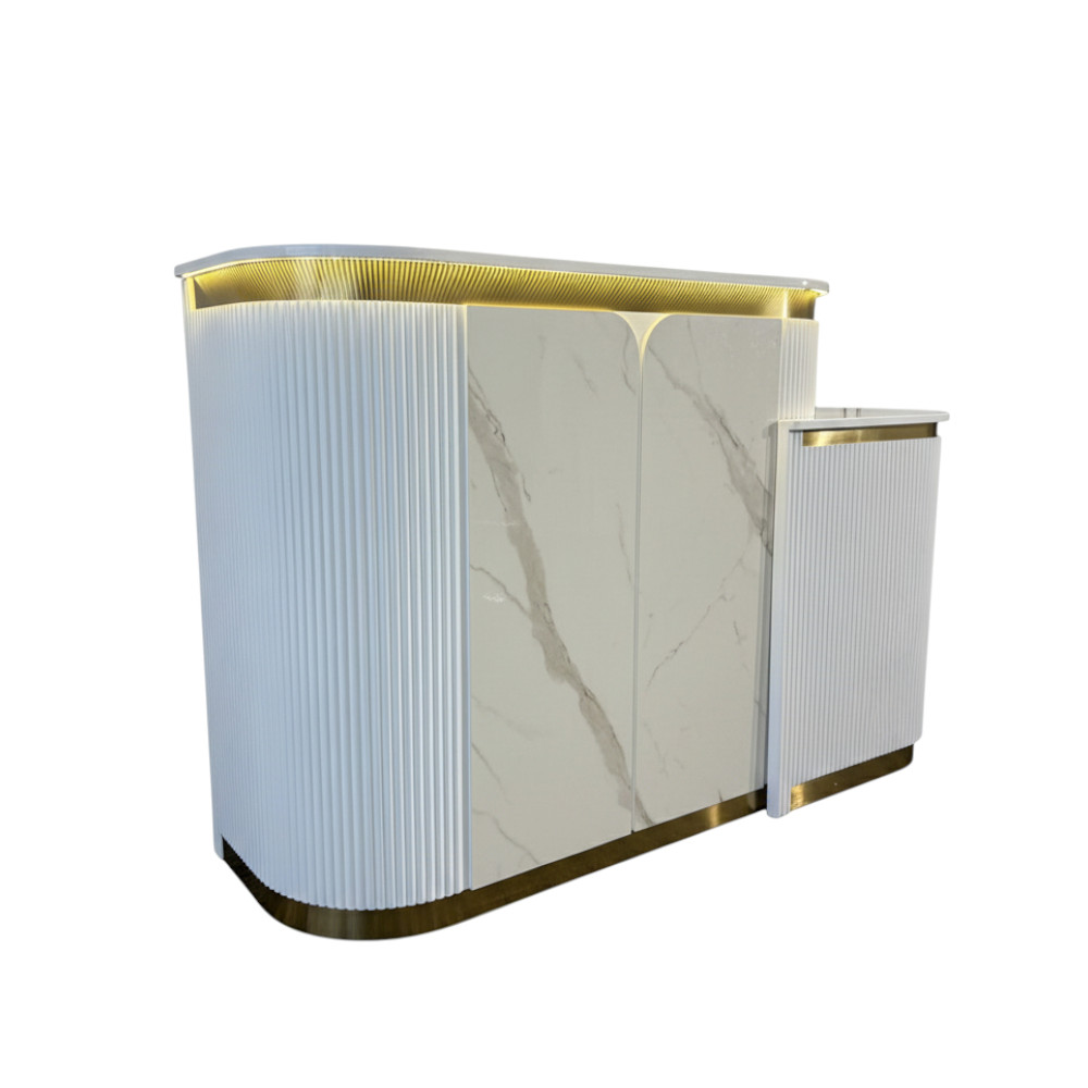 Its façade and work surface are crafted to balance aesthetics with practicality—plenty of space for POS systems, appointment books, and décor, while keeping cable and clutter under control. Durable materials and high-quality finishes ensure Zenith continues to present a strong first impression over time.