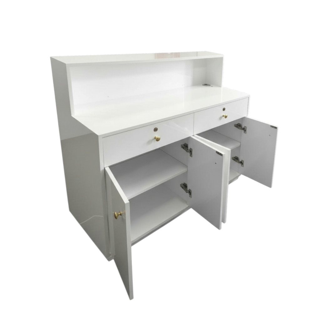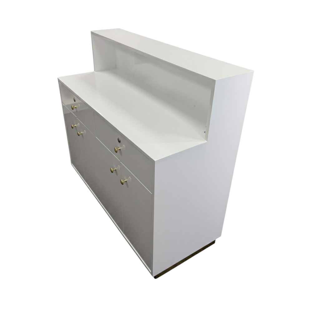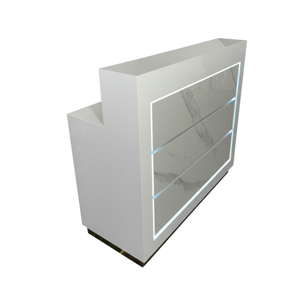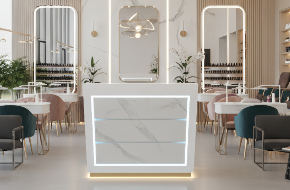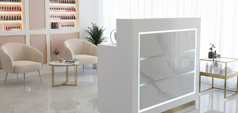 The Zenith Radiant Reception Counter is designed as a flexible front-desk solution for modern salons and spas. Available in multiple lengths (47″, 59″), it can adapt to compact studios, medium-sized salons, or large multi-station spaces while maintaining the same clean, consistent design language.
