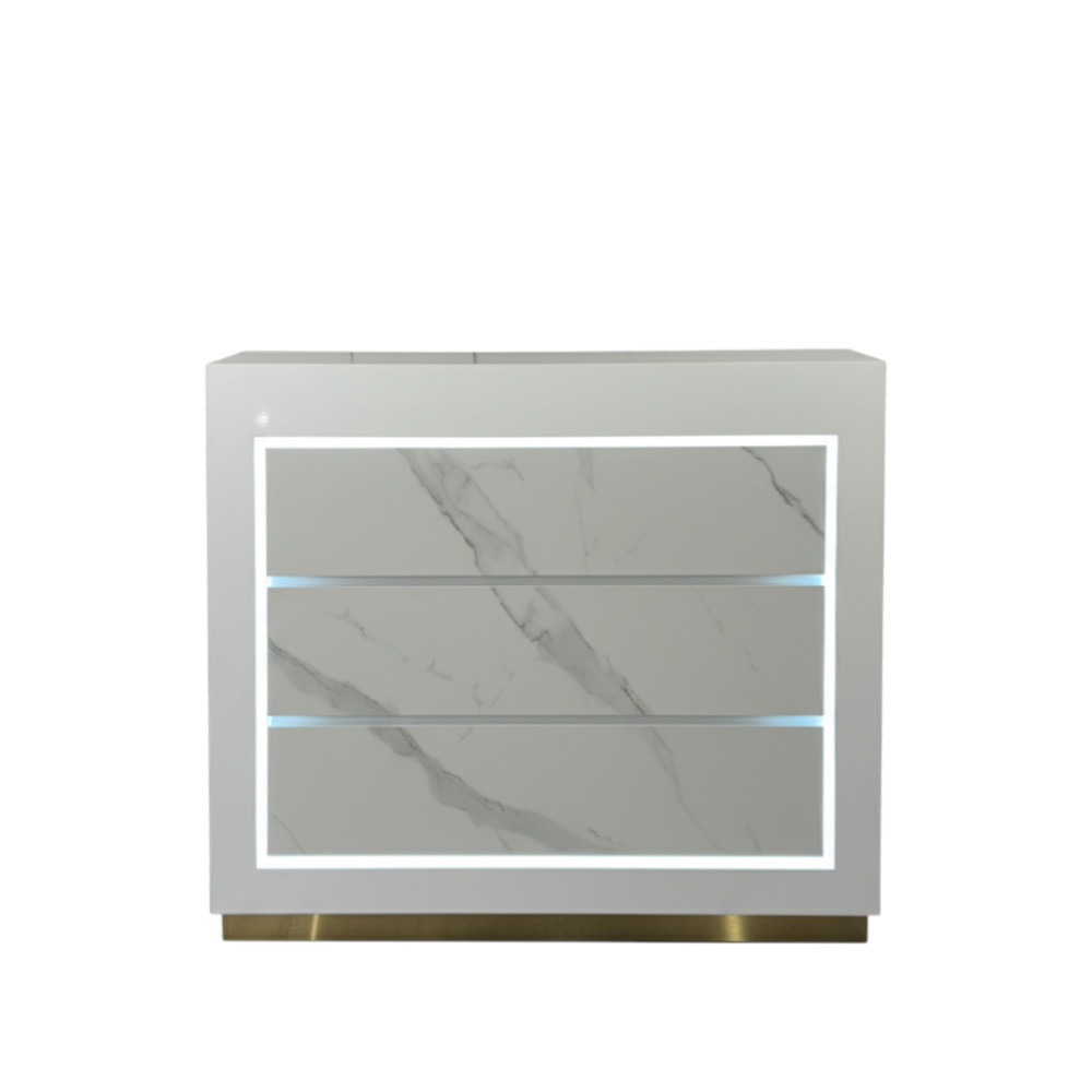Its façade and work surface are crafted to balance aesthetics with practicality—plenty of space for POS systems, appointment books, and décor, while keeping cable and clutter under control. Durable materials and high-quality finishes ensure Zenith continues to present a strong first impression over time.