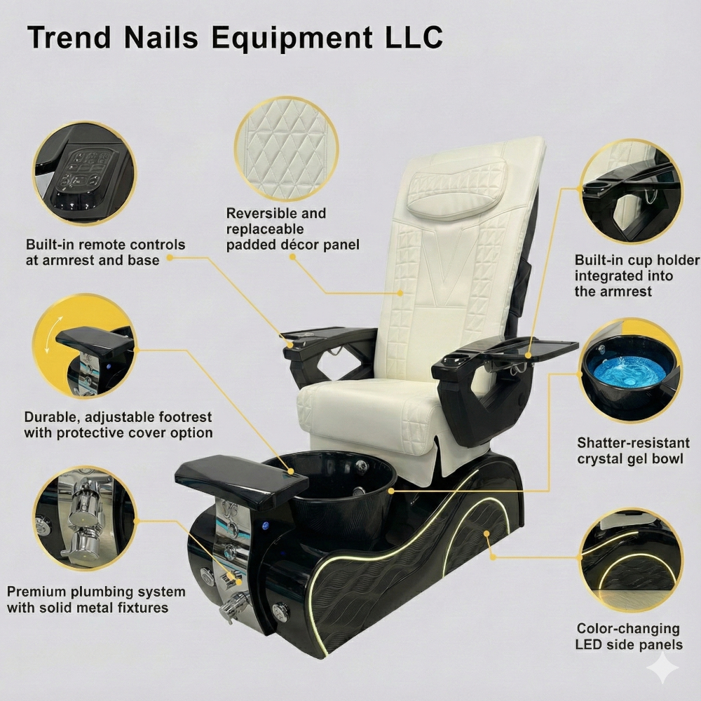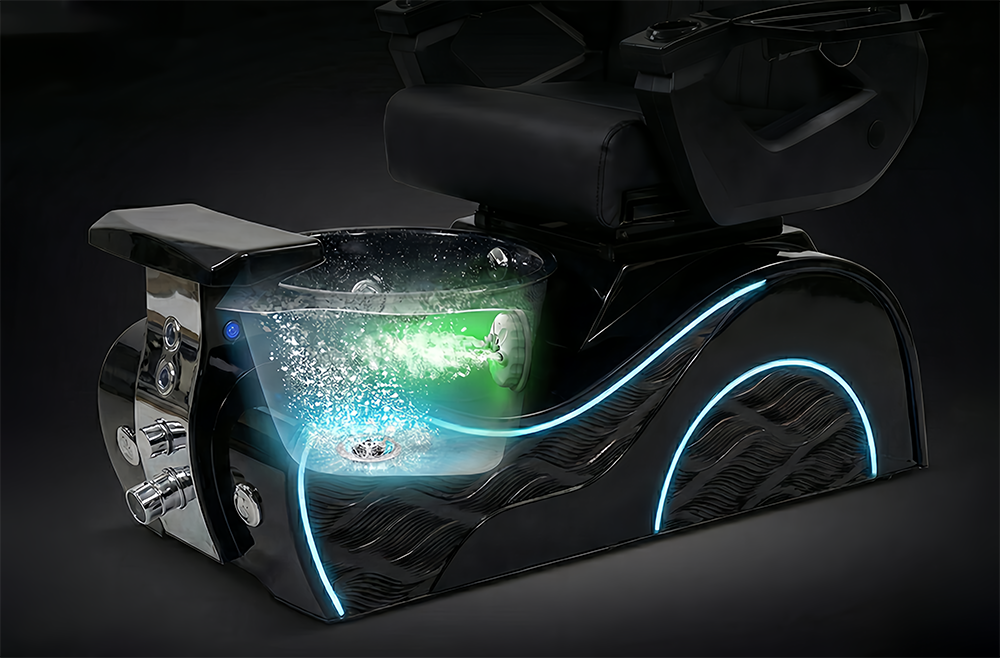 The reinforced spa base features bubble massage technology, odor-reducing ventilation, a UV/LED-friendly cushioned footrest, hot-and-cold plumbing, and a durable gel bowl illuminated by LED lighting. Engineered for high-traffic use, the chair is ETL & UL certified, meeting strict U.S. safety standards.